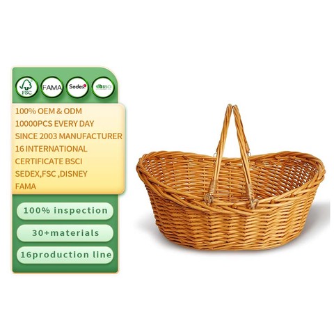 中等浅棕色手工编织柳条篮,用于储物,带手柄编织篮子,用于野餐复活节整理